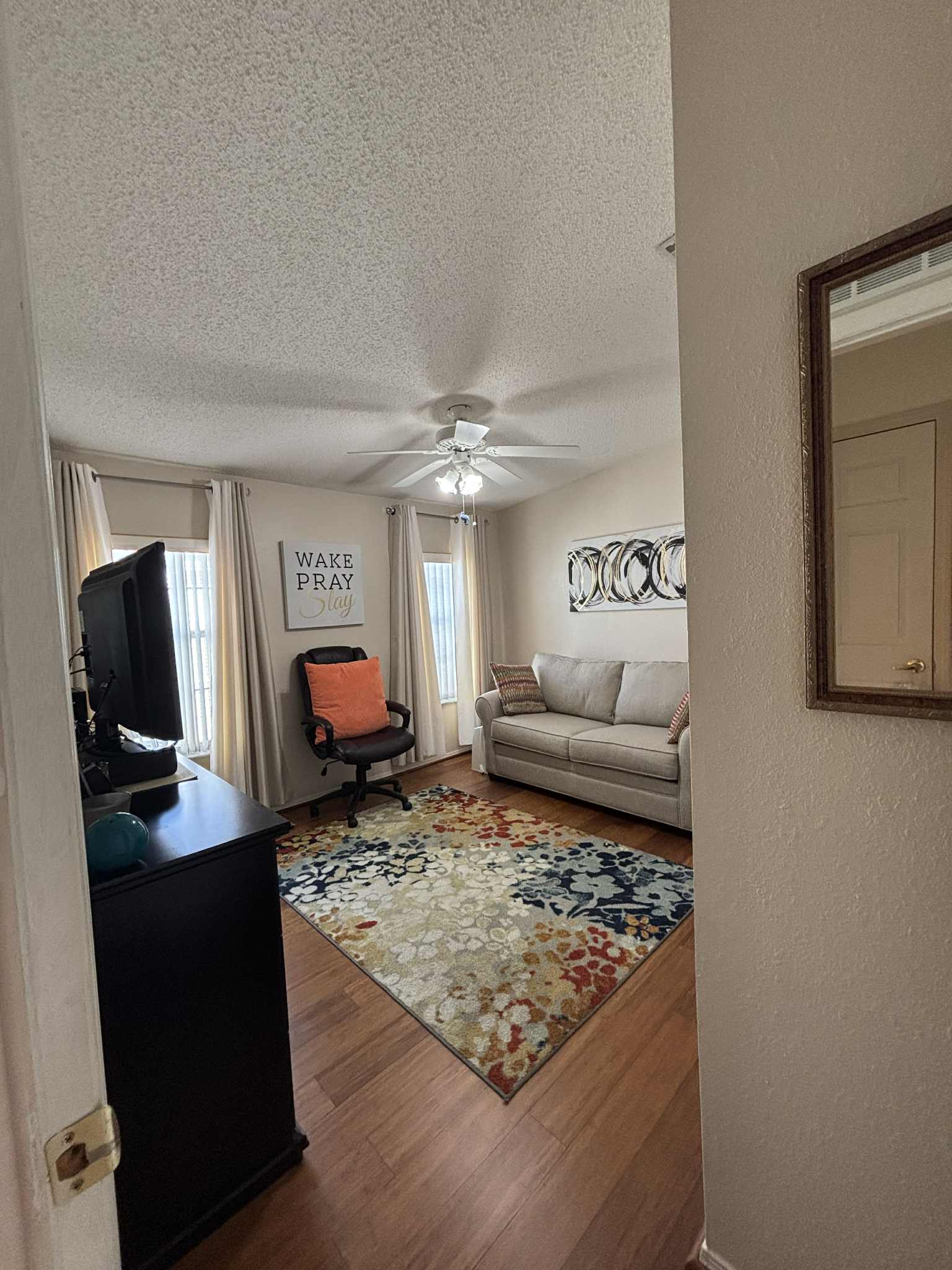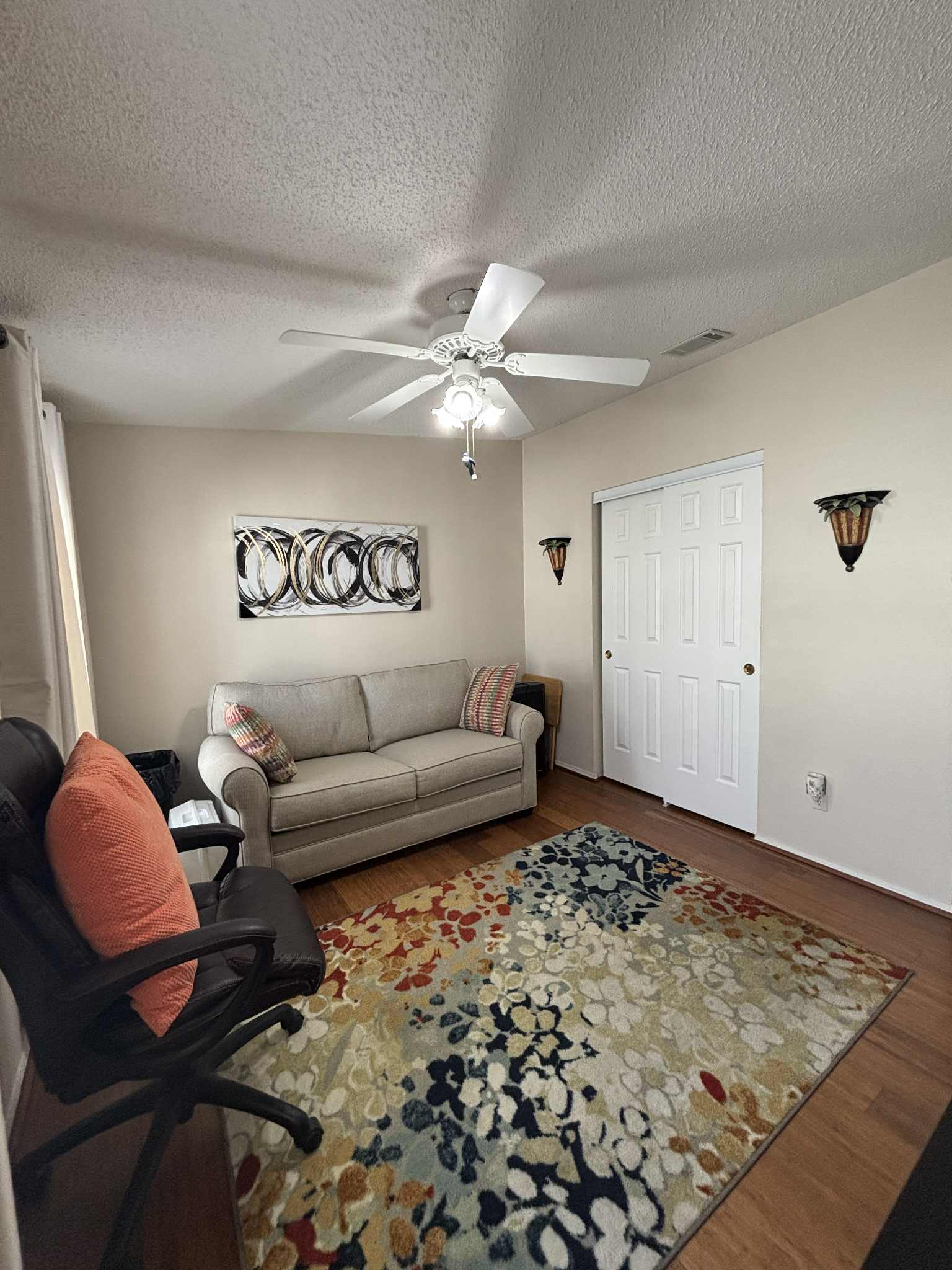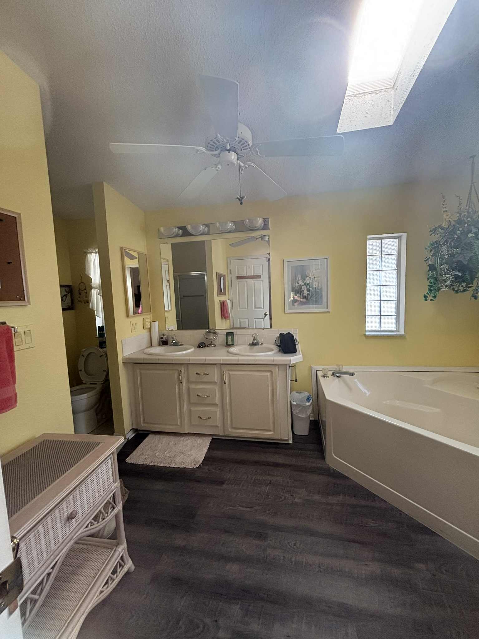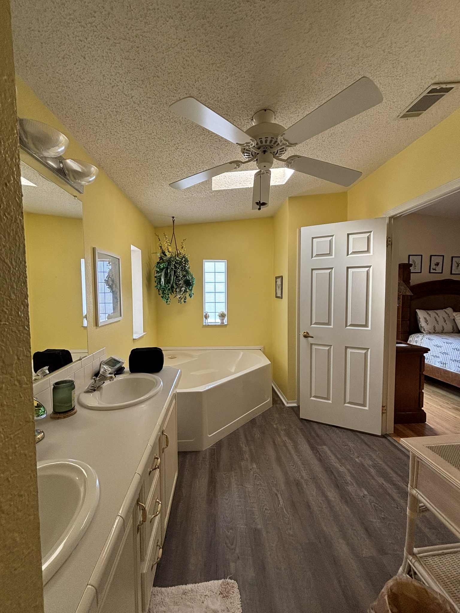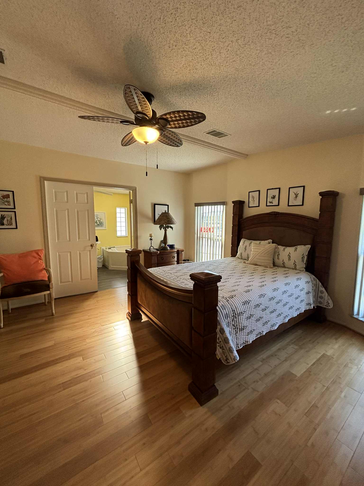 The primary suite offers a peaceful retreat, featuring a long walk-in closet and an en suite bathroom complete with a relaxing garden tub. Two additional bedrooms provide comfort and flexibility for guests, hobbies, or office space. The second bathroom is conveniently located and beautifully maintained.