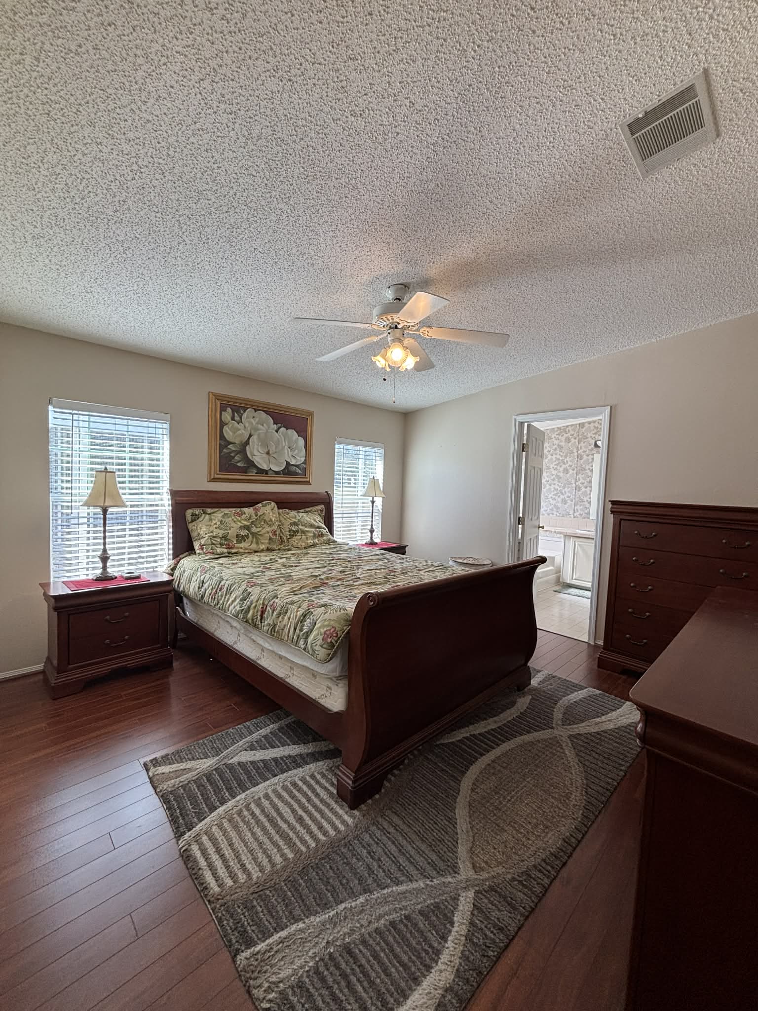The generously sized primary bedroom offers a peaceful sanctuary complete with a private en suite master bath featuring a double sink vanity, large garden soaking tub and separate walk-in shower.