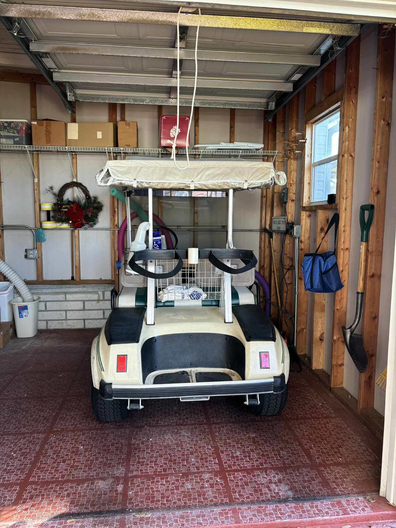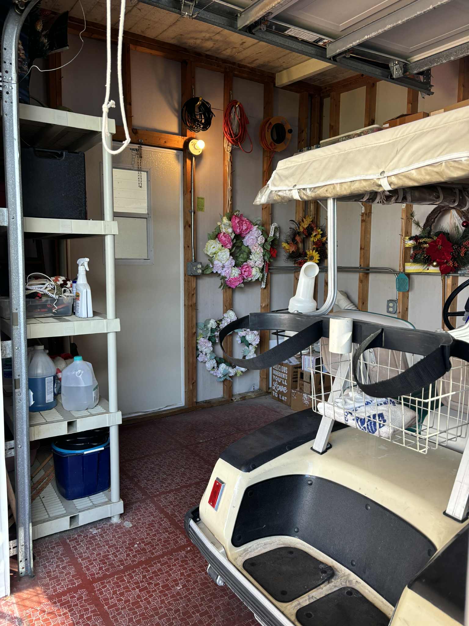 Golf cart garage with shelving