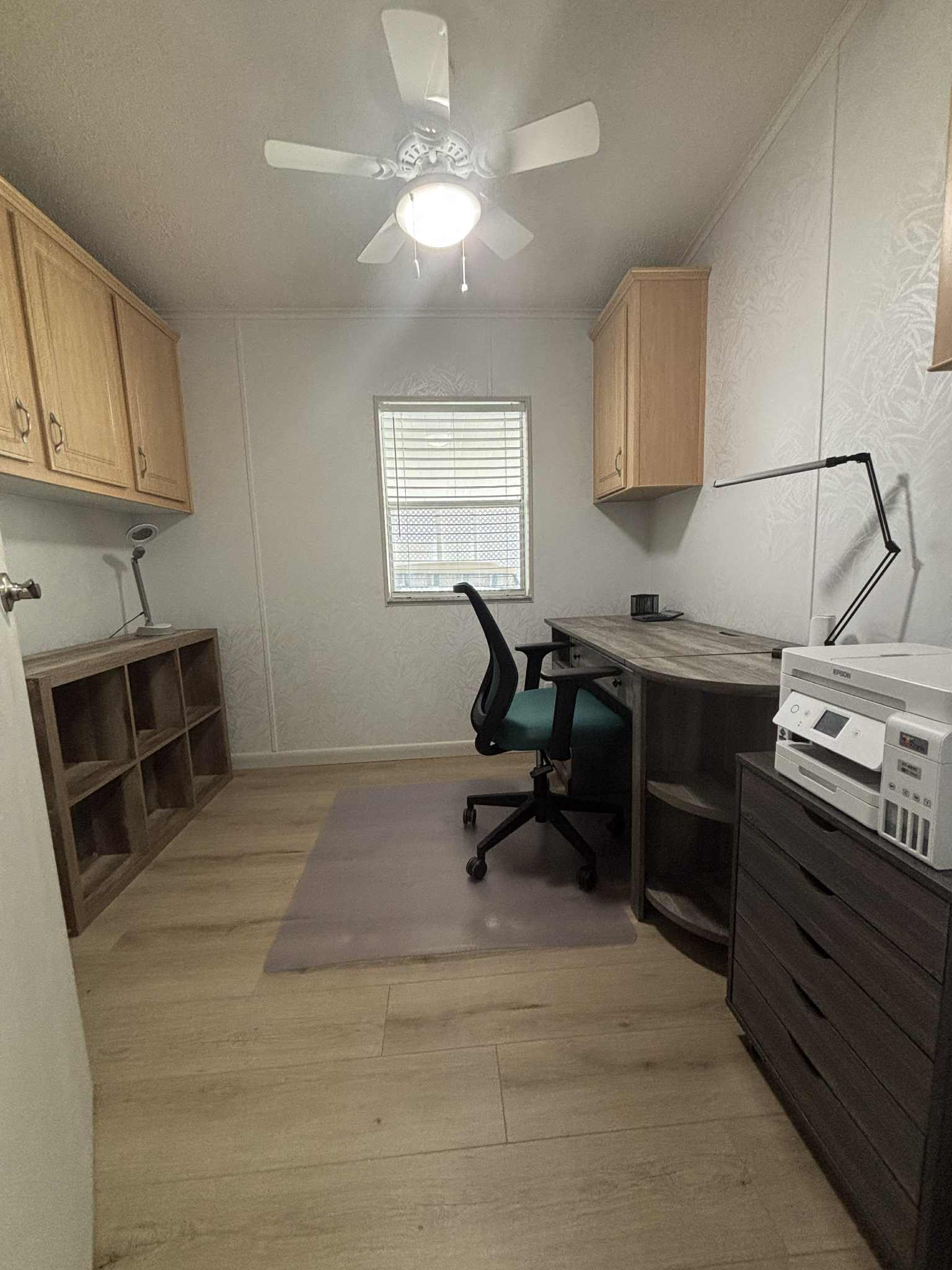 The versatile den comes equipped with a desk ready to use, making it an ideal spot for a home office, hobby room, or peaceful workspace.
